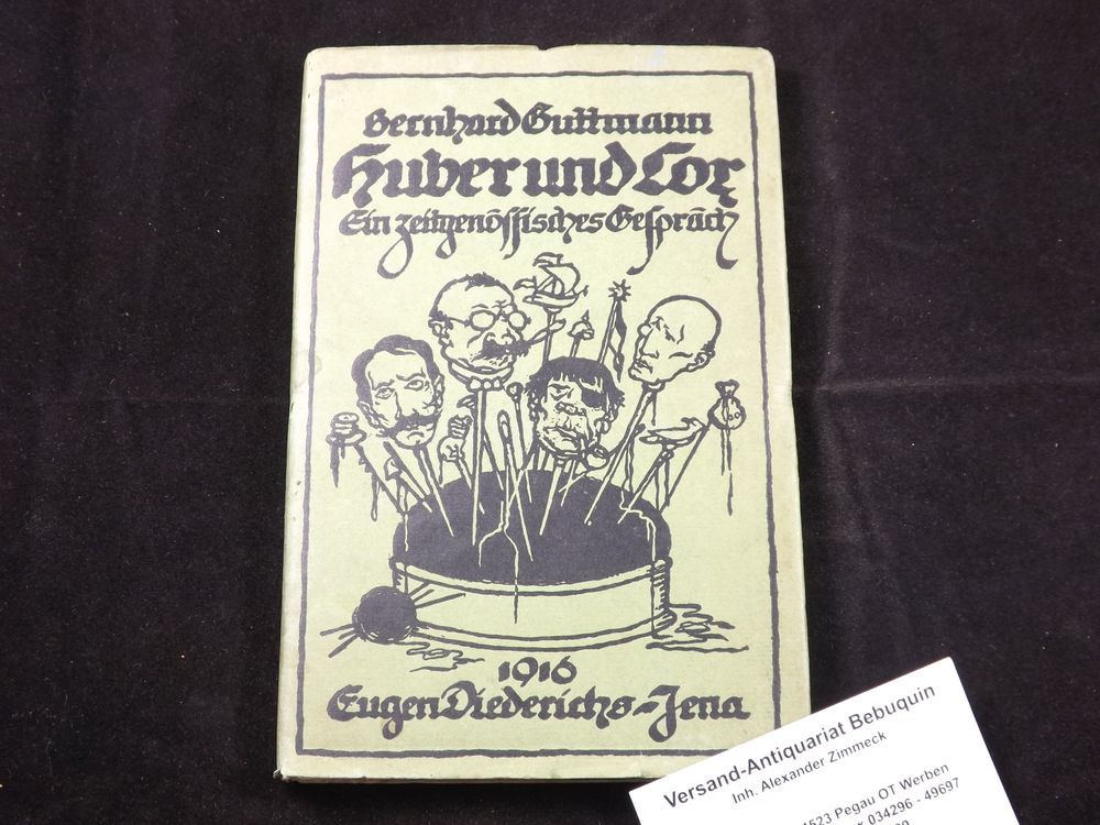 GUTTMANN, Bernhard: Huber und Cox. Ein zeitgenössisches Gespräch. Jena (Diederichs), 1916. 63 S. mit dreiseitigem Gelbschnitt farb. ill. OPb. von Emil Preetorius mit OUmschl. feines Ex. sehr seltene EA des Erstlingswerks.