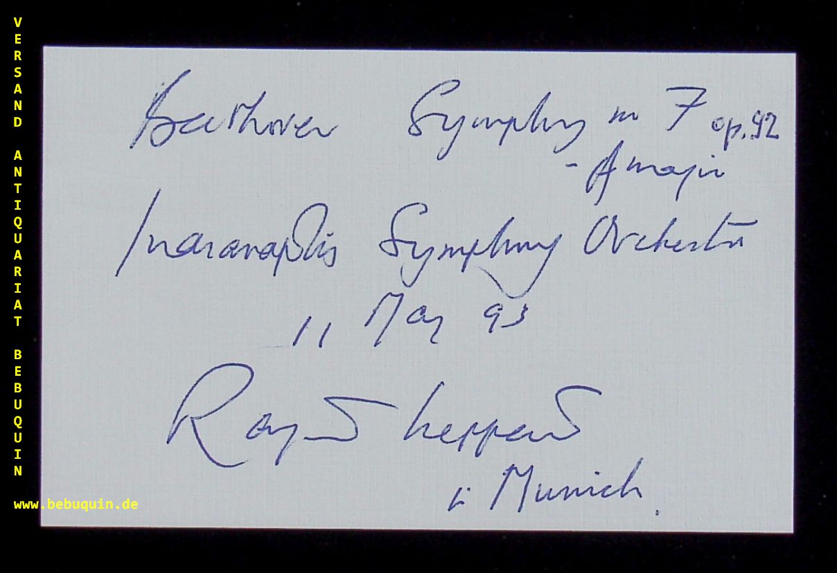 LEPPARD, Raymond (Dirigent): eigenhändig signierte und datierte Autogrammkarte. München (Herkulessaal), 11.5.1993. 8 x 12,5 cm. Karteikarte. Raymond John Leppard (* 11. August 1927 in London; † 22. Oktober 2019 in Indianapolis) war ein britischer Dirigent, Komponist und Cembalist, der durch seine Pionierarbeit bei der Wiederaufführung von barocker Instrumentalmusik und Opern ab den 1960er Jahren bekannt wurde. (Wikipedia)