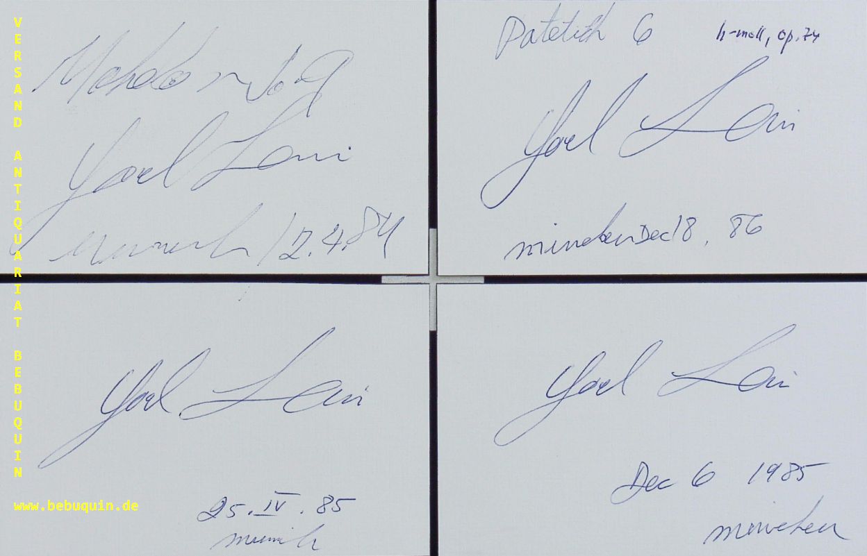 LEVI, Yoel (Dirigent): 4 eigenhändig signierte und datierte Autogrammkarten. München (Herkulessaal), 1984 – 1986. 8 x 12,5 cm. 4 Karteikarte. Yoel Levi (* 16. August 1950 in Satu Mare, Rumänien) ist ein israelischer Musiker und Dirigent. (Wikipedia)
