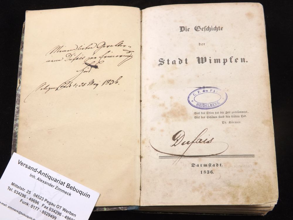 WIMPFEN.– (HEID, Friedrich Heinrich:) Die Geschichte der Stadt Wimpfen. Darmstadt (Heinrich Brill), 1836. VIII, 296 S. + 4 lithogr. Faks. mit Handschriftenproben. HLdr. der Zeit. vereinzelt stockfleckig, etwas gelockert, eine Seite mit kleinem Eckabriss mit minimalem Textverlust. EA der einzigen Veröffentlichung mit eigenhändiger, signierter und datierter Verfasserwidmung auf Vortitel.