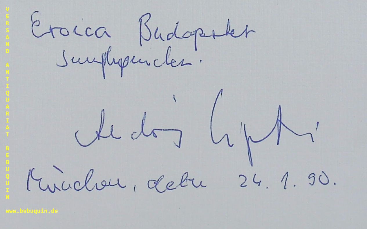 LIGETI, Andras (Dirigent): eigenhändig signierte und datierte Autogrammkarte. München (Philharmonie), 24.1.1990. 8 x 12,5 cm. Karteikarte. András Ligeti (born 1953 in Pécs, Hungary) is a Hungarian classical violinist and conductor. (Wikipedia)