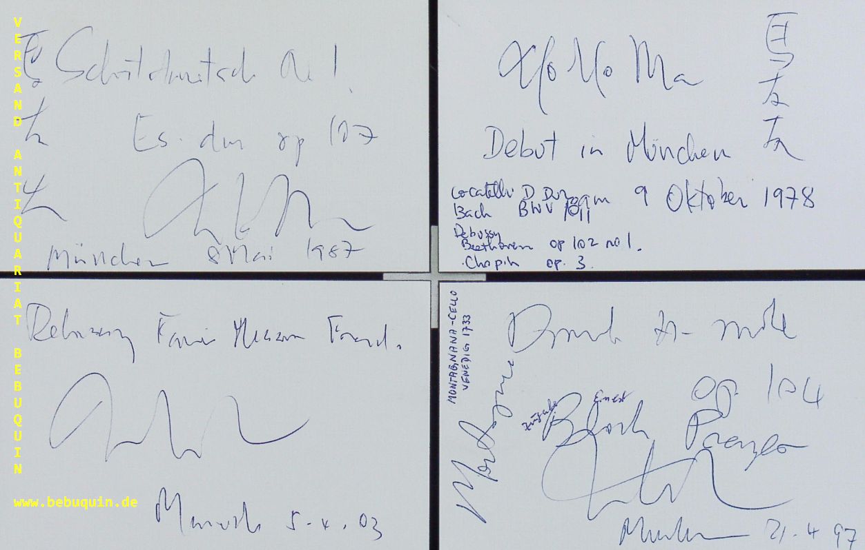 YO YO MA (Cellist): 5 eigenhändig signierte und datierte Portraitseite. München (Herkulessaal), 1978 – 2003. 8 x 12,5 cm. 5 Karteikarten. Yo-Yo Ma (* 7. Oktober 1955 in Paris) ist ein US-amerikanischer Cellist. Seine Diskografie umfasst mehr als 100 Alben, die ihm 19 Grammys einbrachten (Stand 2020). (Wikipedia)