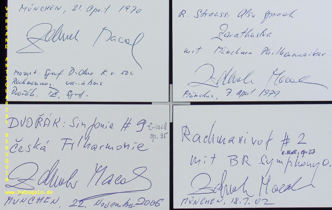 MACAL, Zdenek (Dirigent): 5 eigenhändig signierte und datierte Autogrammkarten mit zahlreichen eigenhändigen Programmbeschreibungen. München (Philharmonie), 1970 – 2006. 8 x 12,5 cm. 5 Karteikarten. Zdenek Mácal (* 8. Januar 1936 in Brünn) ist ein tschechischer Dirigent. (Wikipedia)