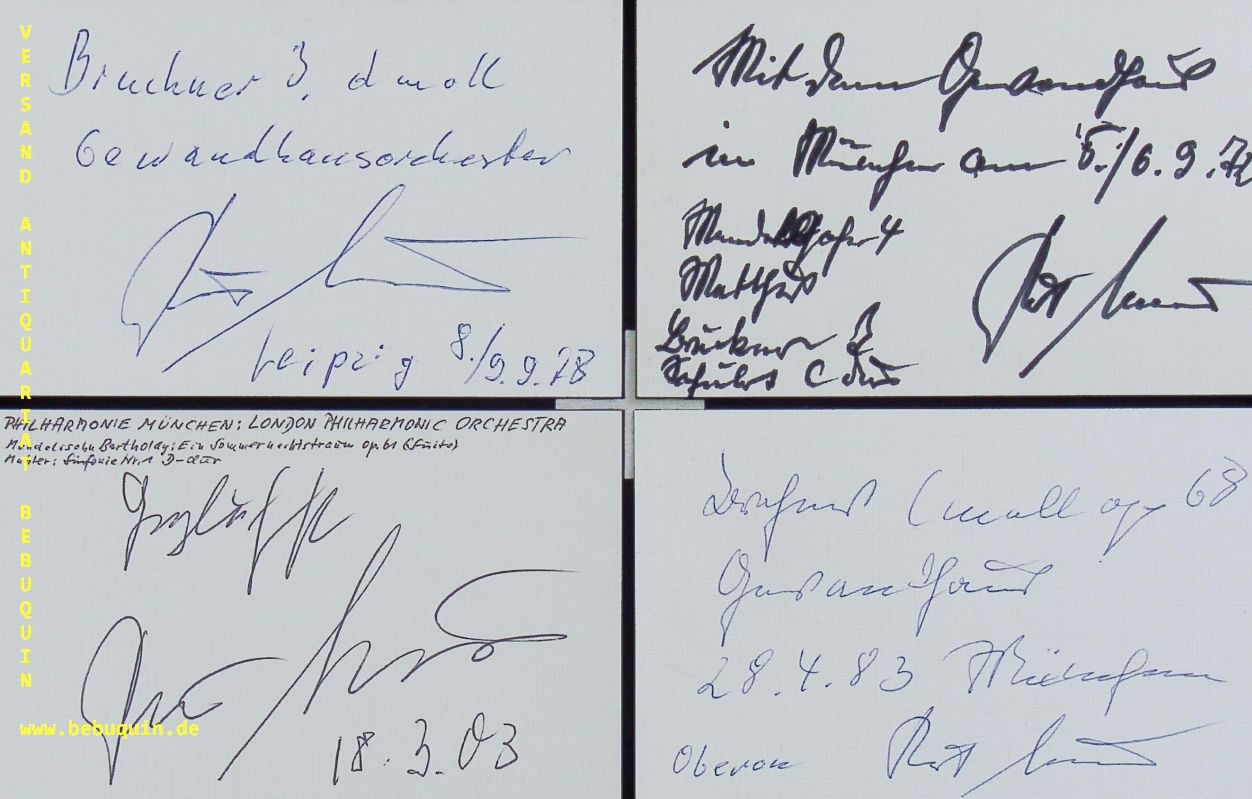 MASUR, Kurt (Dirigent): 18 eigenhändig signierte und datierte Autogrammkarte mit teils auführlichen eigenhändigen Programmbeschreibungen. München (Herkulessaal), 1972 – 2003. 8 x 12,5 cm. 18 Karteikarten. Kurt Masur (* 18. Juli 1927 in Brieg, Niederschlesien; † 19. Dezember 2015 in Greenwich, Connecticut) war ein deutscher Dirigent. Er war von 1970 bis 1996 Gewandhauskapellmeister in Leipzig, von 1991 bis 2002 Musikdirektor der New Yorker Philharmoniker und von 2000 bis 2007 Chefdirigent des London Philharmonic Orchestra. (Wikipedia)
