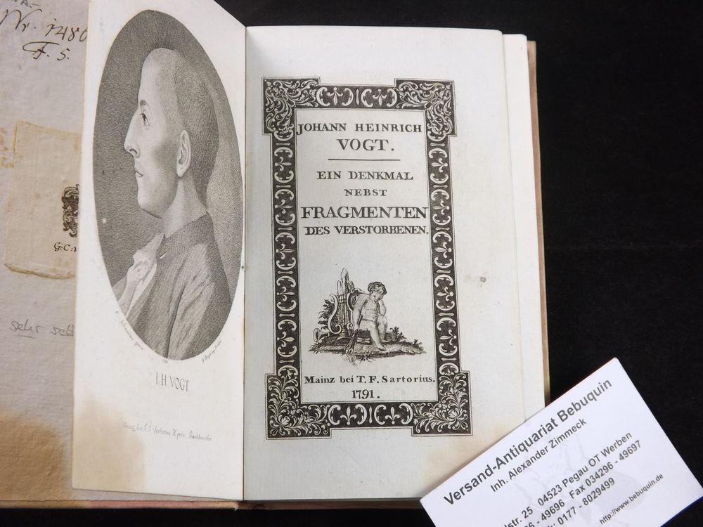 VOGT, Johann Heinrich: Ein Denkmal nebst Fragmenten des Verstorbenen. Herausgegeben von Wilhelm Dietler. Mainz (Sartorius), 1791. kl. 8°. XVIII S. Subskribentenverz., 151 S. mit gest. Porträt in Medaillonform von G. Reussing nach C. Schneider als Frontispiz und gestochenem Titel. Pb. der Zeit oder wenig später. eine Einbandecke braunfleckig, teils nach innen durchgeschlagen, Ex libris auf Innendeckel, insgesamt noch gut erhalten. EA des Erstlingswerks. Biographie des im November 1789 verstorbenen, ungemein beliebten Professors der Philosophie in Mainz, Johann Heinrich Vogt. Er war der ältere Bruder von Niclas Vogt (1756-1836), Geschichtsschreiber, Staatsmann und heute noch bekannter Verfasser der „Rheinischen Sagen und Geschichten“. Von dem Wirken des älteren Vogt gibt es nur wenige schriftliche Zeugnisse.