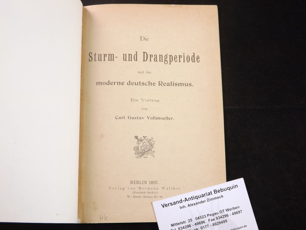 VOLLMOELLER, Carl Gustav: Die Sturm- und Drangperiode und der mod. Realismus. Ein Vortrag. Berlin (Walther), 1897. 52 S. neuer Kart. in altem Design mit Leinenrücken. EA des Erstlingswerks WG² 1.