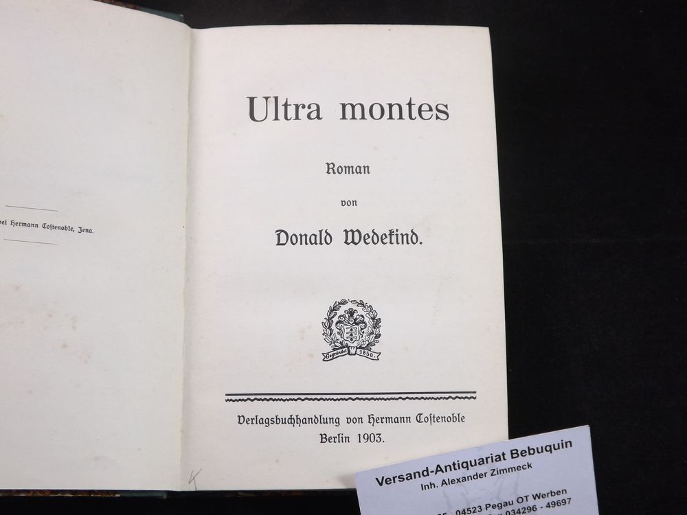 WEDEKIND, Donald: Ultra montes. Berlin (Costenoble), 1903. 295 S. HLn. der Zeit mit goldgeprägtem Rücken. gutes Ex. EA des Erstlingswerks des Bruders von Frank Wedekind, der sich 6 Jahre nach Erscheinen des lasziven Romans das Leben nahm.