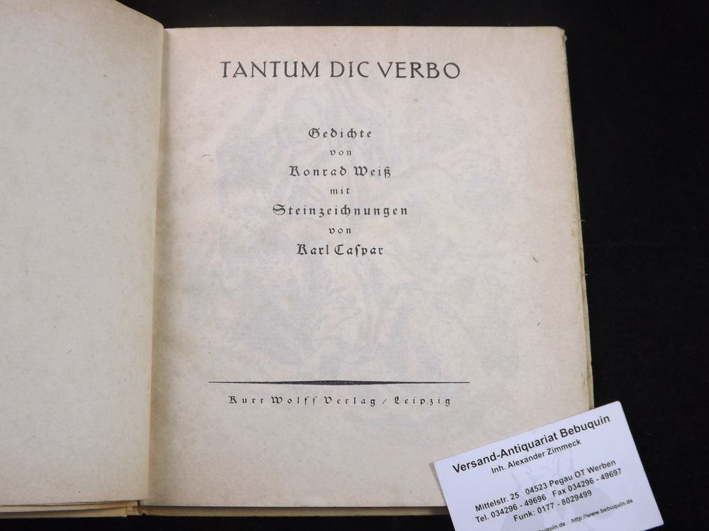 WEISS, Konrad: Tantum dic verbo. Leipzig (Kurt Wolff), 1918. Gr. 8°. 72 S. mit acht meist ganzseitigen Steinzeichnungen von Karl Caspar. OPb. mit Farblithographie von Karl Caspar. kaum gebräunt. Nr. 207 von 450 Ex. der signierten EA des Erstlingswerks WG² 1.
