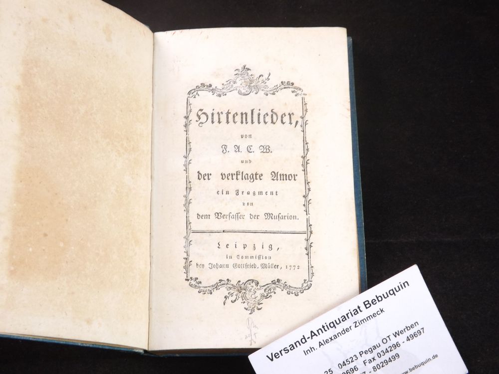 WERTHES, Friedrich August Clemens: Hirtenlieder und der verklagte Amor. Ein Fragment von dem Verfasser der Musarion. Leipzig (Müller), 1772. kl. 8°. 216 S. mit diversen Vignetten. späterer Pb. mit goldgeprägtem Rückenschild. feines Ex. aeltene EA des ersten Werkes, wohl von Wieland herausgegeben. WG² 1 mit abweichender, offenbar falscher Seitenzahl.