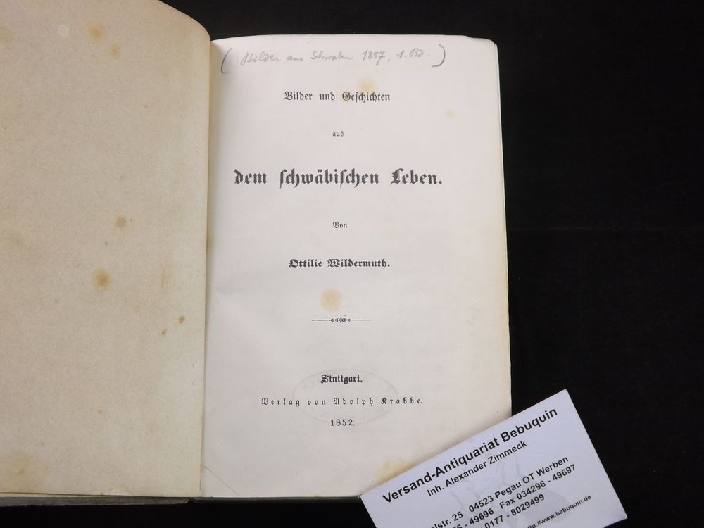 WILDERMUTH, Ottilie: Bilder und Geschichten aus dem schwäbischen Leben. Stuttgart (Krabbe), 1852. VI, 410 S. Ln. der Zeit mit aufgesetztem OPb. Einband stärker, innen leicht fingerfleckig, NaU, Kanten angeplatzt. EA der ersten eigenständigen Veröffentlichung WG² 2.