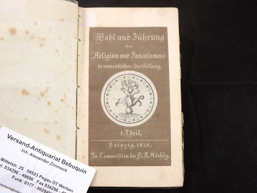 WILHELMI, Heinrich Friedrich: Wahl und Führung oder Religion und Fanatismus in romantischer Darstellung. 2 Bände in 1 Bd. Leipzig Köchly), 1818. kl. 8°. VIII, 384, 444 S. mit 2 lithographischen Titeln. Pb. der Zeit mit goldgeprägtem Rückenschild. Kanten leicht berieben, innen nur vereinzelt stockfleckig, gutes Ex. EA des Erstlingswerks und Bildungs- und Erziehungsromans Goedeke X, 253.1.
