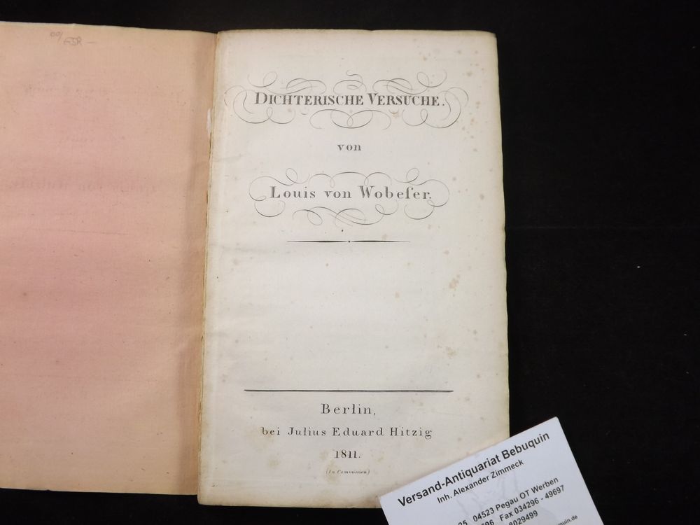 WOBESER, Louis von: Dichterische Versuche. Berlin (Hitzig), 1811. 1 Bl., 118 S. OBr. Vorderdeckel lose, Kanten unbeschnitten, vereinzelt braunfleckig. EA des einzigen Werkes Goedeke VII, 422,51.