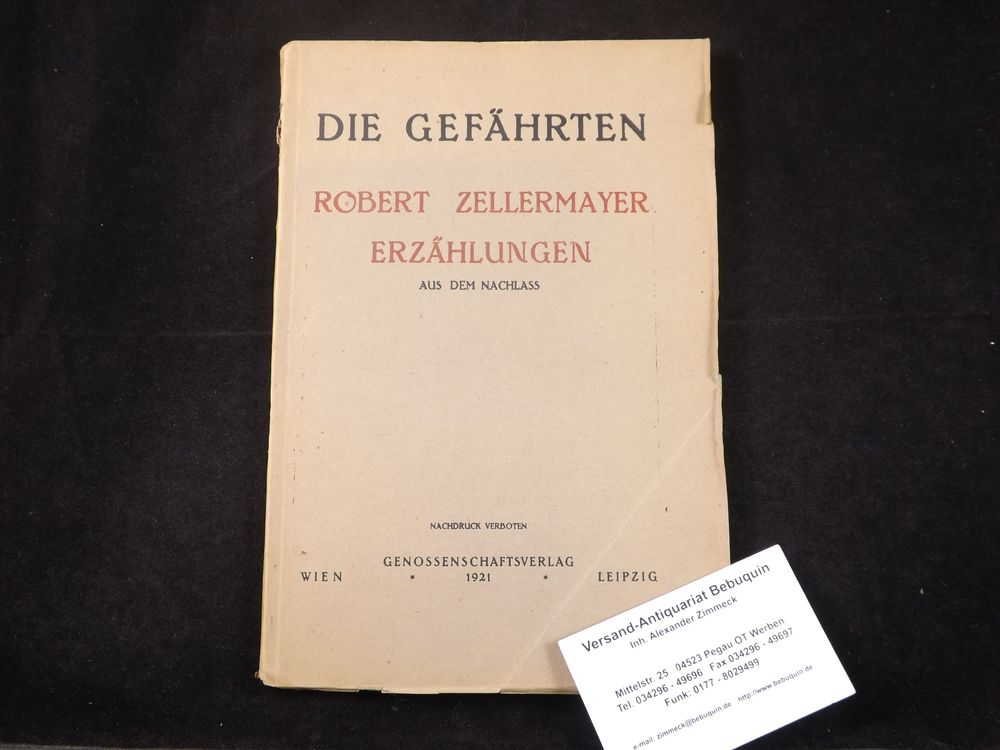 ZELLERMAYER, Robert: Erzählungen aus dem Nachlass. Wien, (Genossenschaft) 1921. Gr. 8° 72 S. OKart. Rücken lädiert, Vorderdeckel mit leichtem Eckknick. = Die Gefährten Jg. 4, Heft 11. Erste und einzige Publikation Raabe 342.1.