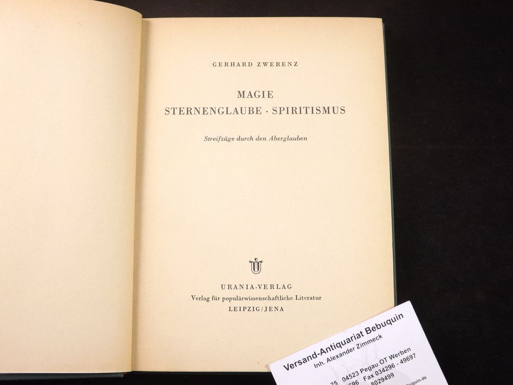 ZWERENZ, Gerhard: Magie – Sternenglaube – Spiritismus. Streifzüge durch den Aberglauben. Leipzig (Urania), 1956. 231 S. + 18 Abb. auf 8 Bildtafeln. ill. OLn. EA des Erstlingswerks.