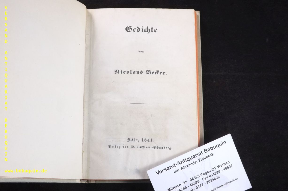BECKER , Nicolaus: Gedichte. Köln (Du Monz), 1841. kl. 8°. VI, 218 S., 2 Bl. etwas späterer Pb mit goldgeprägtem Rückenschild. Titelseite leicht gebräunt. EA und einzige Veröffentlichung des rheinisch-patrotischen jung verstorbenen Dichters. Heine dichtete im „Wintermärchen“: „Zu Biberich hab ich Steine verschluckt,/ wahrhaftig sie schmeckten nicht lecker! / Doch schwerer liegen im Magen mir/ die Verse von Niklas Becker.“