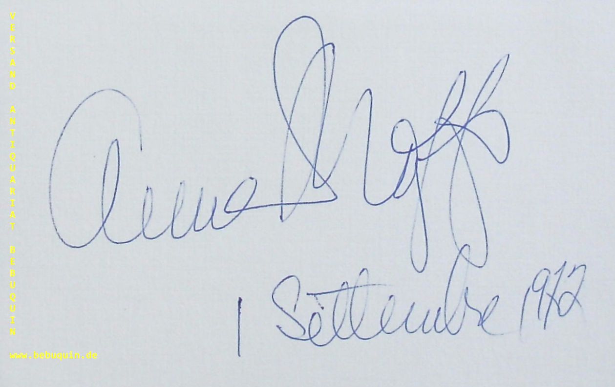 MOFFO, Anna (Sopran): eigenhändig signierte und datierte Autogrammkarte. München (Kongresssaal), 1.9.1972. 8 x 12,5 cm. Karteikarte. Anna Moffo (* 27. Juni 1932 in Wayne oder Philadelphia, Pennsylvania; † 9. März 2006 in New York City, New York) war eine US-amerikanische Opernsängerin (lyrischer Sopran) und Schauspielerin. (Wikipedia)