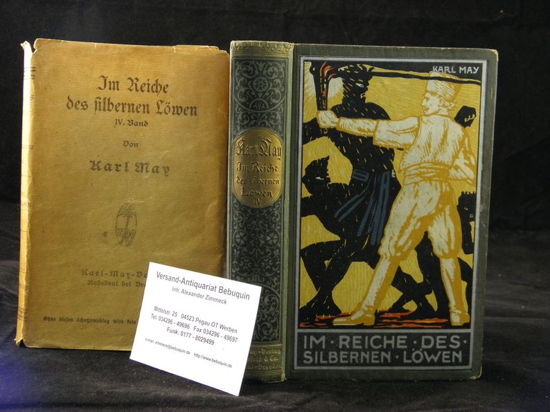 MAY, Karl: Im Reiche des silbernen Löwen. IV. Bd. Reiseerzählung. 47.– 56. Tsd. Radebeul (Karl May), (1922). 644 S. farb. ill. OPb mit OUmschl. (DB 58b). Umschlag gebräunt, schönes Ex. mit glänzendem Rückengold. = Gesammelte Werke, Bd. 29. Hermesmeier / Schmatz GW 29.10.