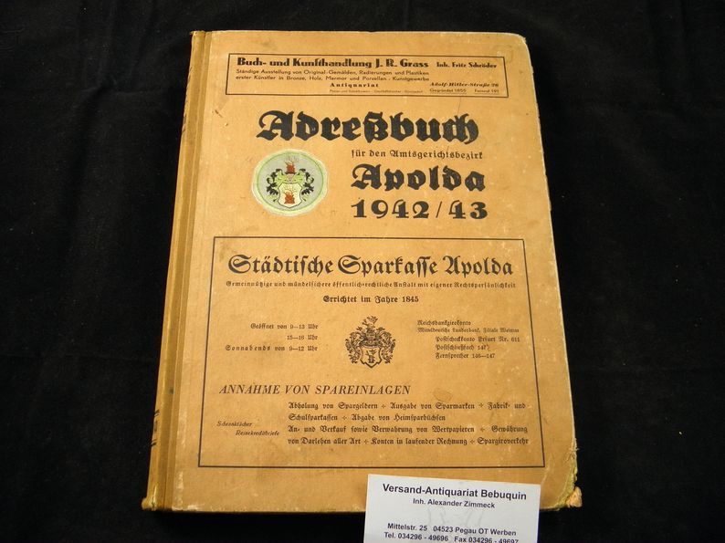APOLDA.– ADRESSBUCH FÜR DEN AMTSGERICHTSBEZIRK APOLDA 1942/43.– Enthält enthält die Einwohner der Stadt Apolda sowie der umliegenden Gemeinden. Erfurt (Mitteldeutsche), 1942. 4°. 10 Bl., 256 S. + dem neuesten Plan der Stadt Apolda. ill. OHLn. leicht angeschmutzt, wenige Randeinrisse in Titelseite und Karte. sehr seltenes Adressbuch. Enthält die Einwohner der Stadt Apolda, sowie der Gemeinden