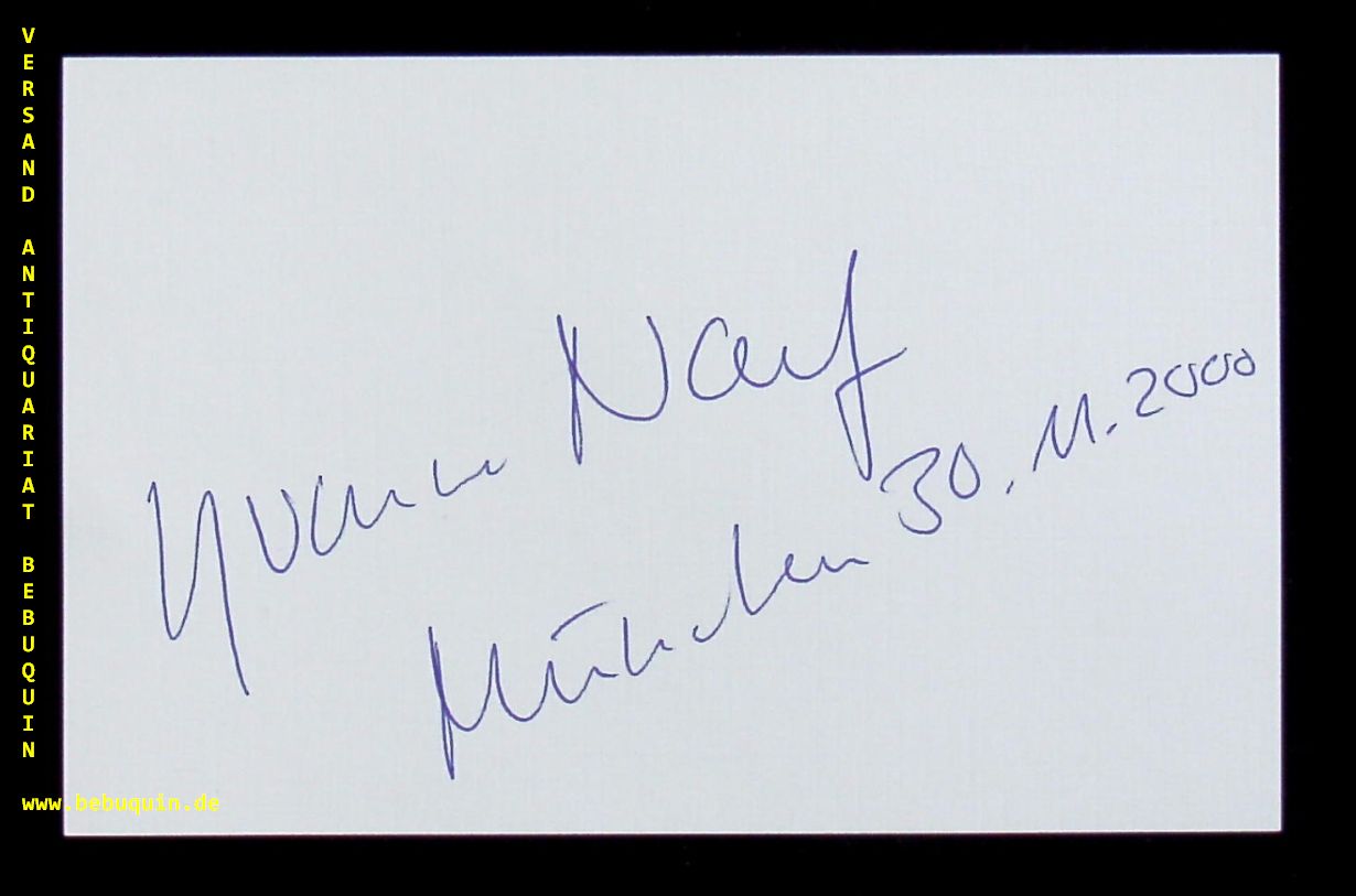 NAEF, Yvonne (Mezzosopran): eigenhändig signierte und datierte Autogrammkarte. München (Philharmonie), 30.11.2000. 8 x 12,5 cm. Karteikarte. Yvonne Naef (* 9. November 1957 in Schaffhausen) ist eine Schweizer Opern- und Konzertsängerin in der Stimmlage dramatischer Mezzosopran. (Wikipedia)