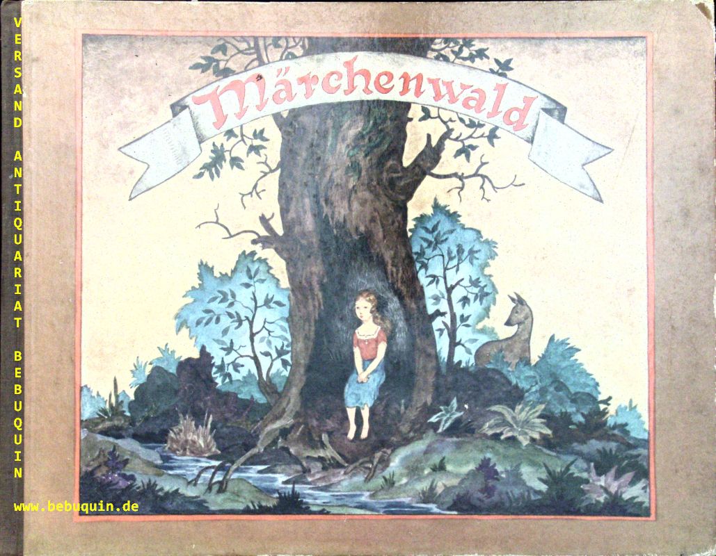 BARTA.– MÄRCHENWALD.– Ein Kinderbuch nach Texten der Gebrüder Grimm und Ludwig Bechstein. Leipzig (Anton), (1920). Quer 4°. 36 S. mit farbigem Titel und 8 ganzseitigen Farbbildern von Erwin von Barta. farb. ill. OHLn. Deckel mit leichten Kratzspuren, sonst von sehr feiner Erhaltung. = Verlagsnummer 815. Sehr seltene EA hier mit einem von Kohlweyer 3 / 1051 abweichenden Einbandbild.