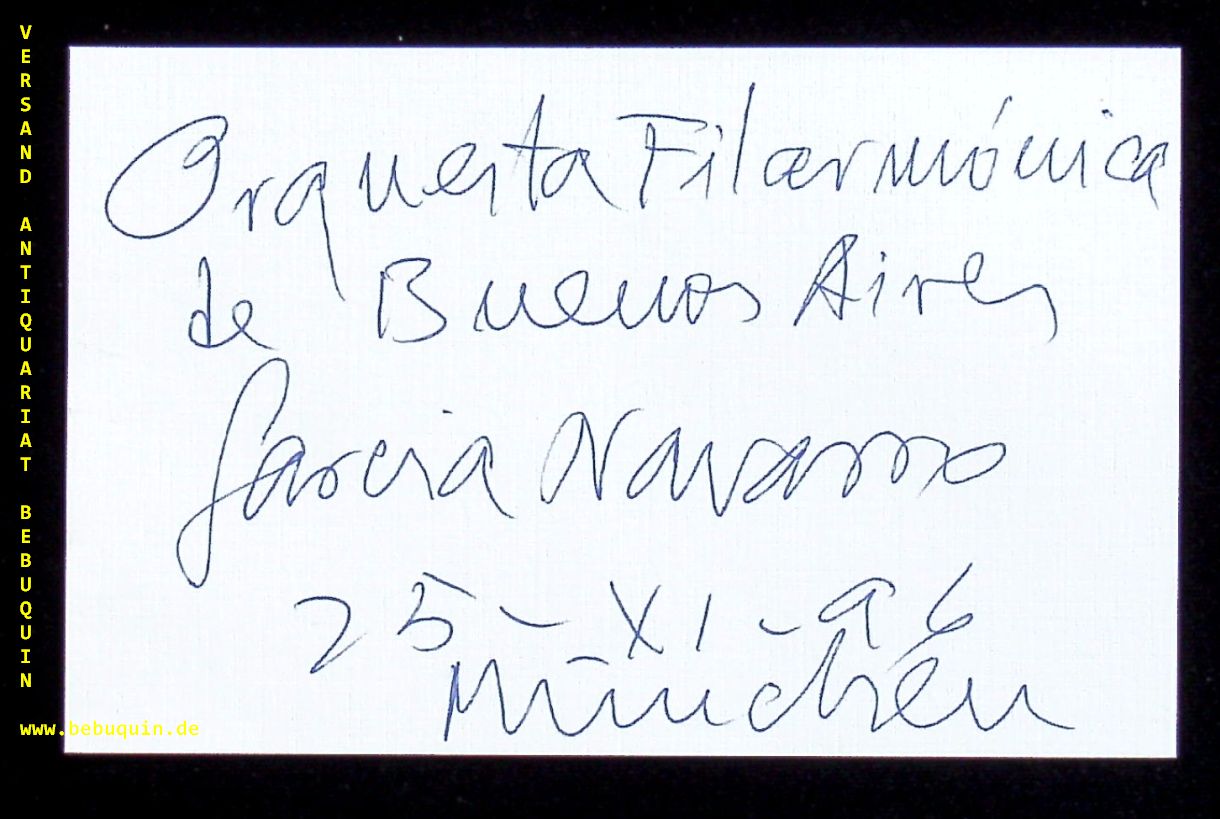 NAVARRO, Garcia (Dirigent): eigenhändig signierte und datierte Autogrammkarte. München, 25.11.1996.. 8 x 12,5 cm. Karteikarte. Luis Antonio García Navarro (* 30. April 1941 in Chiva, Provinz Valencia; † 10. Oktober 2001 in Madrid) war ein spanischer Dirigent. (Wikipedia)