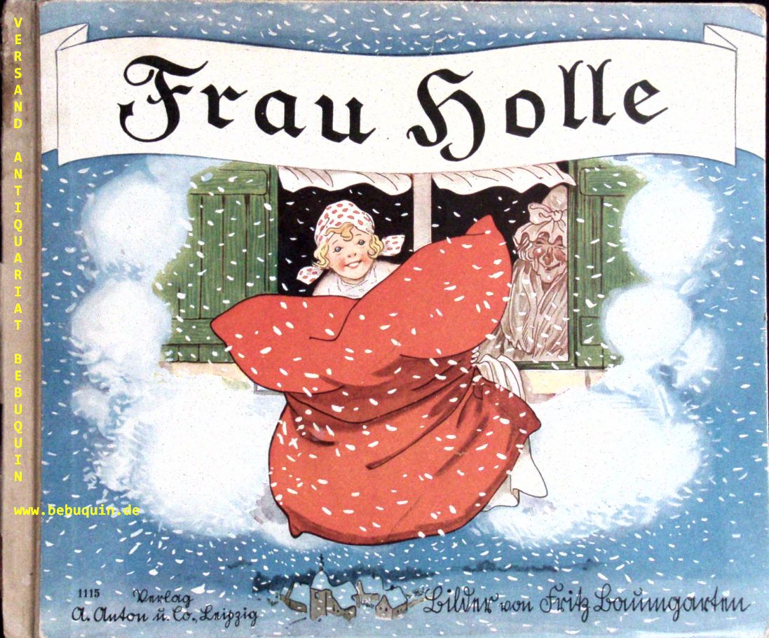 BAUMGARTEN.– GRIMM, Brüder: Frau Holle. 8.– 17. Tsd. Leipzig (Anton), 1940. Quer 4°. 8 Bl. mit z.T. farb. Bildern von Fritz Baumgarten. farb. ill. OHLn. leicht gelockert. Diese Ausgabe erschien ohne Vorsätze, erweitert um zahlr. s/w Textabb. und Text in Gründruck. Blaume 177.