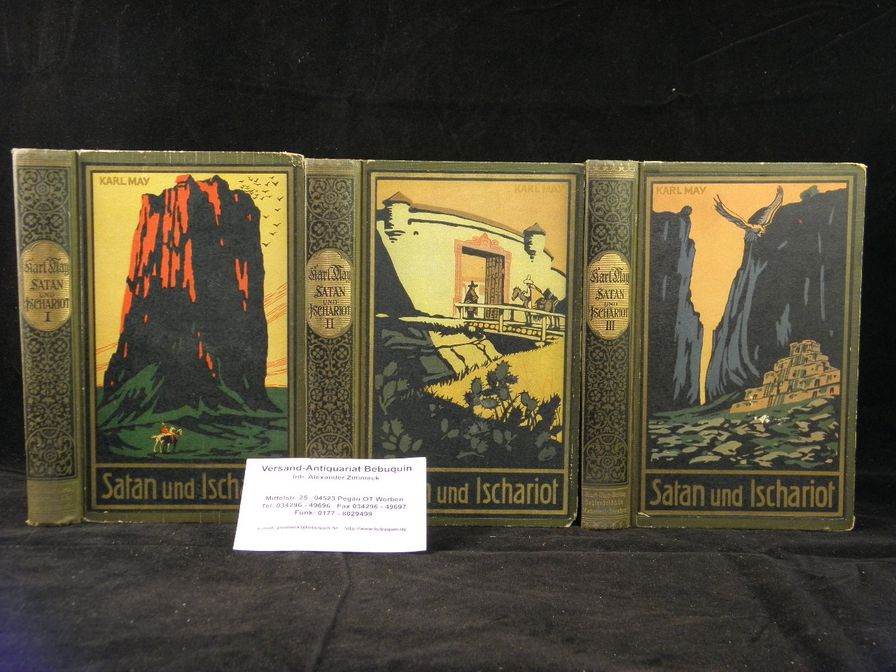 MAY, Karl: Satan und Ischariot. Reiseerzählung in 3 Bänden. Volksausgabe. 84 – 94., 81 – 91., 81 – 90. Tsd. Radebeul (Karl May), (1934). 470 (1) , 452 (1) , 478 (1) S. farb. ill. OHLn. NaV, leicht schief, Verlagsangabe am Rücken etwas geblichen. Bd 3 mit minimaler Schabestelle am Deckel, insgesamt sehr ordentlich erhalten. = Gesammelte Werke, Bd. 20 – 22. recht seltene Ausgabe dieser ersten Auflage der umfangreich bearbeiteten Satan-Trilogie, die erst Jahre nach ihrer Fertigstellung in den Handel kam. Diese billige Volksausgabe erschien aus verkaufstechnischen Gründen noch einige Monate später. Hermesmeier / Schmatz GW 20.13; 21.12; 22.12.