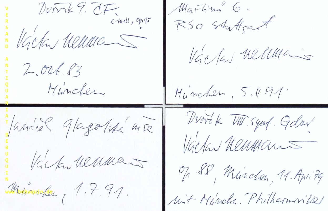 NEUMANN, Vaclav (Dirigent): 13 eigenhändig signierte und datierte Autogrammkarten. München (Philharmonie), 1962 – 1991. 8 x 12,5 cm. 13 Karteikarten. Václav Neumann (* 29. September 1920 in Prag; † 2. September 1995 in Wien) war ein tschechischer Dirigent, Violin- und Viola-Spieler. (Wikipedia)