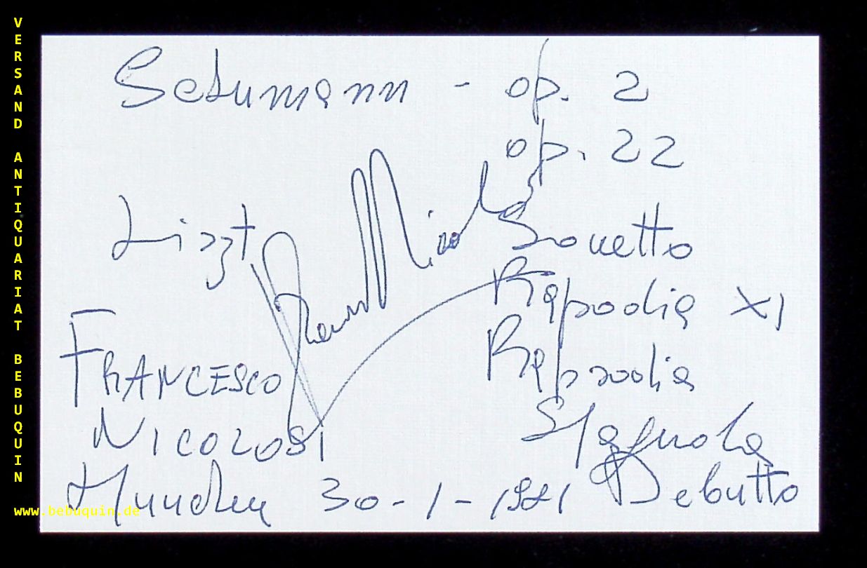 NICOLOSI, Francesco (Pianist): eigenhändig datierte und signierte Autogrammkarte mit eigenhändiger detaillierter Programmbeschreibung. München (Philharmonie), 30.1.1981. 8 x 12,5 cm. Karteikarte. Francesco Nicolosi (born December 7, 1954) is an Italian pianist. (Wikipedia)
