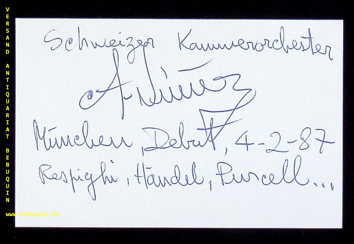 NUNEZ, Antonio (Dirigent): eigenhändig signierte und datierte Autogrammkarte. MIt dem Schweizer Kammerorchester. München, 4.2.1987. 8 x 12,5 cm. Karteikarte. Antonio Nunez, Violine, wurde in Marin (Spanien) geboren. Er wuchs in Uruguay auf und begann mit acht Jahren, Geige zu spielen. Mit einem Stipendium der Accademia Internationale di Musica da Camera in Rom kam er 1968 nach Europa und absolvierte weitere Studien bei Sandor Vegh und Henryk Szeryng. Von 1972 bis 2006 war er erster Konzertmeister des Sinfonieorchesters Basel, ab 1978 auch