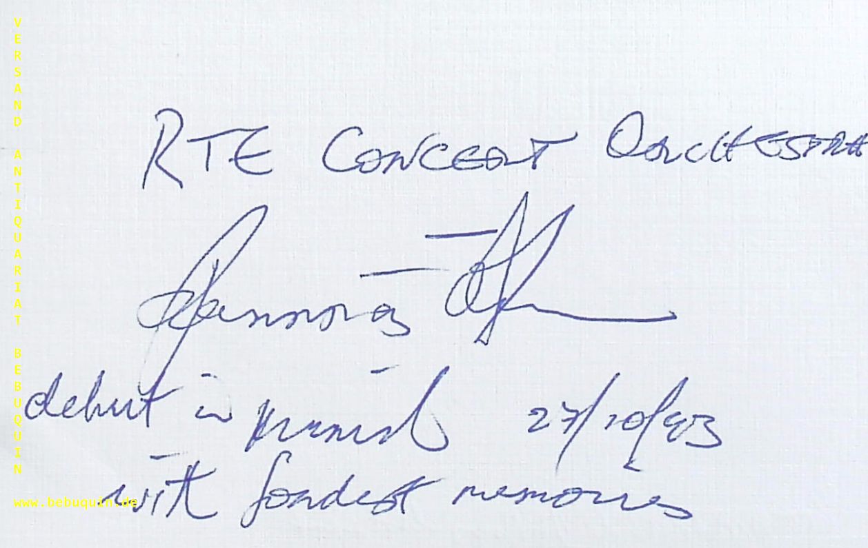 O’DUINN, Proinnsias (Dirigent): eigenhändig signierte und datierte Autogrammkarte. München (Philharmonie), 27.10.1993. 8 x 12.5 cm. Kateikarte. Proinnsías Ó Duinn was born in Dublin Ireland. He studied ‘cello, piano and orchestration privately and at the Royal Irish Academy of Music and the College of Music in Dublin.
