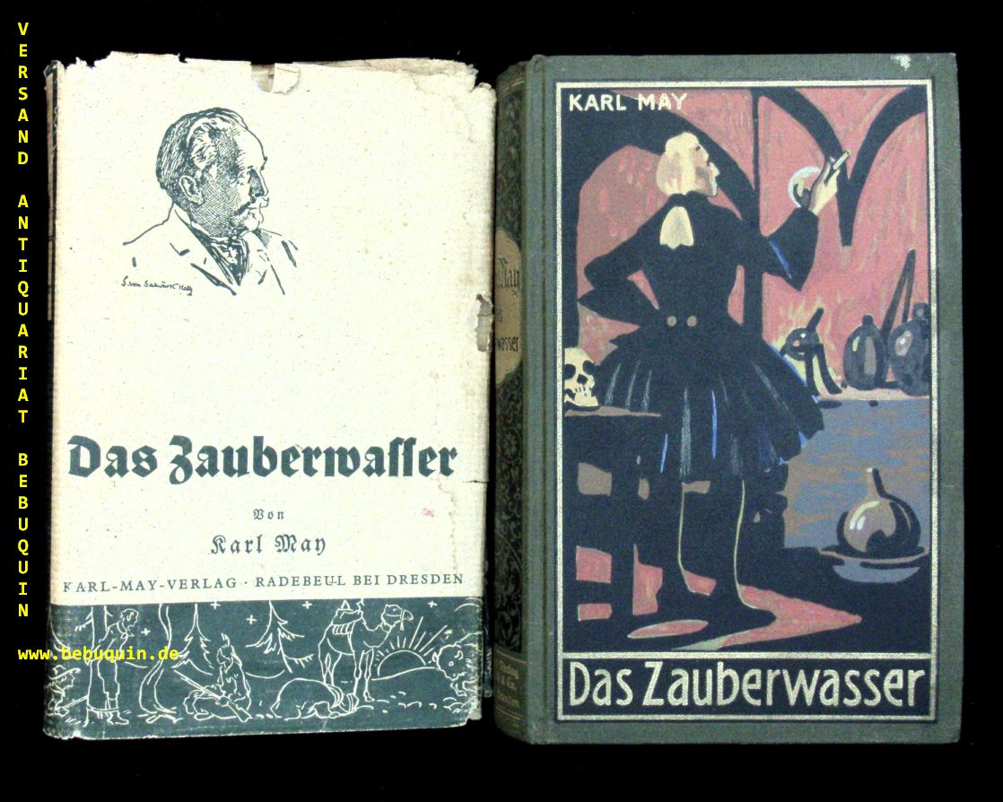 MAY, Karl: Das Zauberwasser und andere Erzählungen. 24.– 32. Tsd. Radebeul (Karl May), 1941. 484 S. farb. farb. ill. OLn. mit OUmschl. (SU 5.1). Umschlag etwas knitterig, Block leicht schief, farbstarker Einband mit goldglänzendem Rücken. = Gesammelte Werke, Bd. 48. Hermesmeier / Schmatz GW 48.3. Letzte Auflage, von der maximal 3000 Ex. gebunden wurden. Von größter Seltenheit.