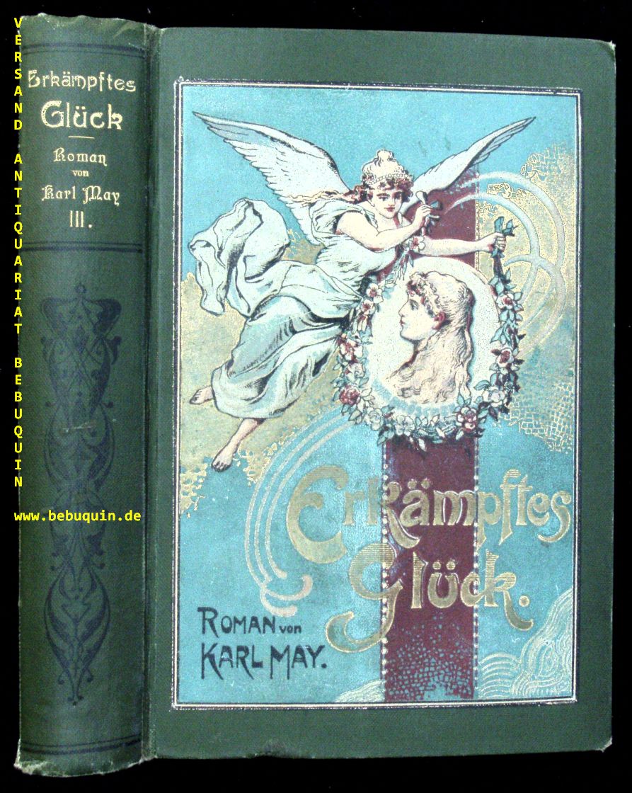 MAY, Karl: Erkämpftes Glück, Bd. III. Das Waldröschen oder Die Verfolgung rund um die Erde. Enthüllungsroman der menschlichen Gesellschaft. Bd. VI. Niedersedlitz-Dresden (Münchmeyer), (1902). 632 S. mit 88 Illustrationen. farb. ill. OLn mit den Blumenstraussvorsatzpapieren. NaV, strahlender Einband und goldglänzender Rücken. Absolut seltene erste Buchausgabe, Bandausgabe genannt, in sehr schöner Erhaltung – Ausgabe. Plaul 347.1F.