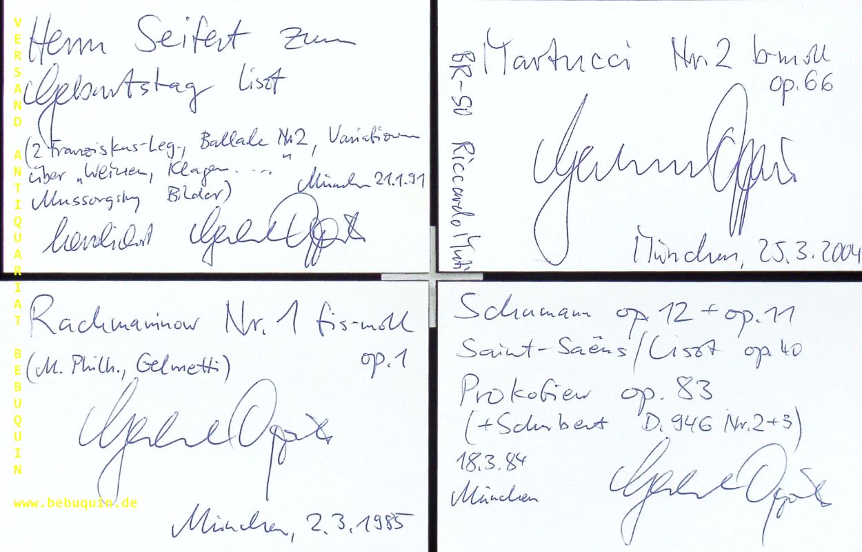 OPPITZ, Gerhard (Pianist): 19 eigenhändig signierte und datierte Autogrammkarten mit schönen eigenghändigen Programmbeschreibungen. München (Philharmonie), 1977 – 2009. 8 x 10,5 cm. 19 Karteikarten. Gerhard Oppitz (* 5. Februar 1953 in Frauenau/Bayern) ist ein deutscher Pianist. Er setzt sich auch für zeitgenössische Komponisten wie Lutoslawski, Ligeti, Messiaen, Henze, Veerhoff, Sauter und Boulez ein. (Wikipedia)