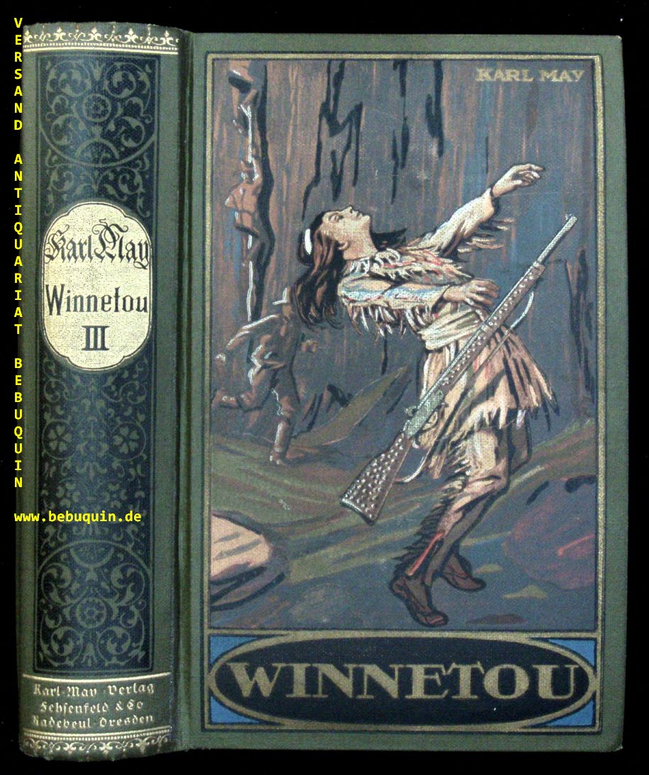 MAY, Karl: Winnetou. III. Band. 221.– 238. Tsd. Radebeul (Karl May), (1931). 629 (2) S. farb. ill. OLn. NaV, farbstarker Einabnd und goldglänzender Rücken. = Gesammelte Werke, Bd. 9.