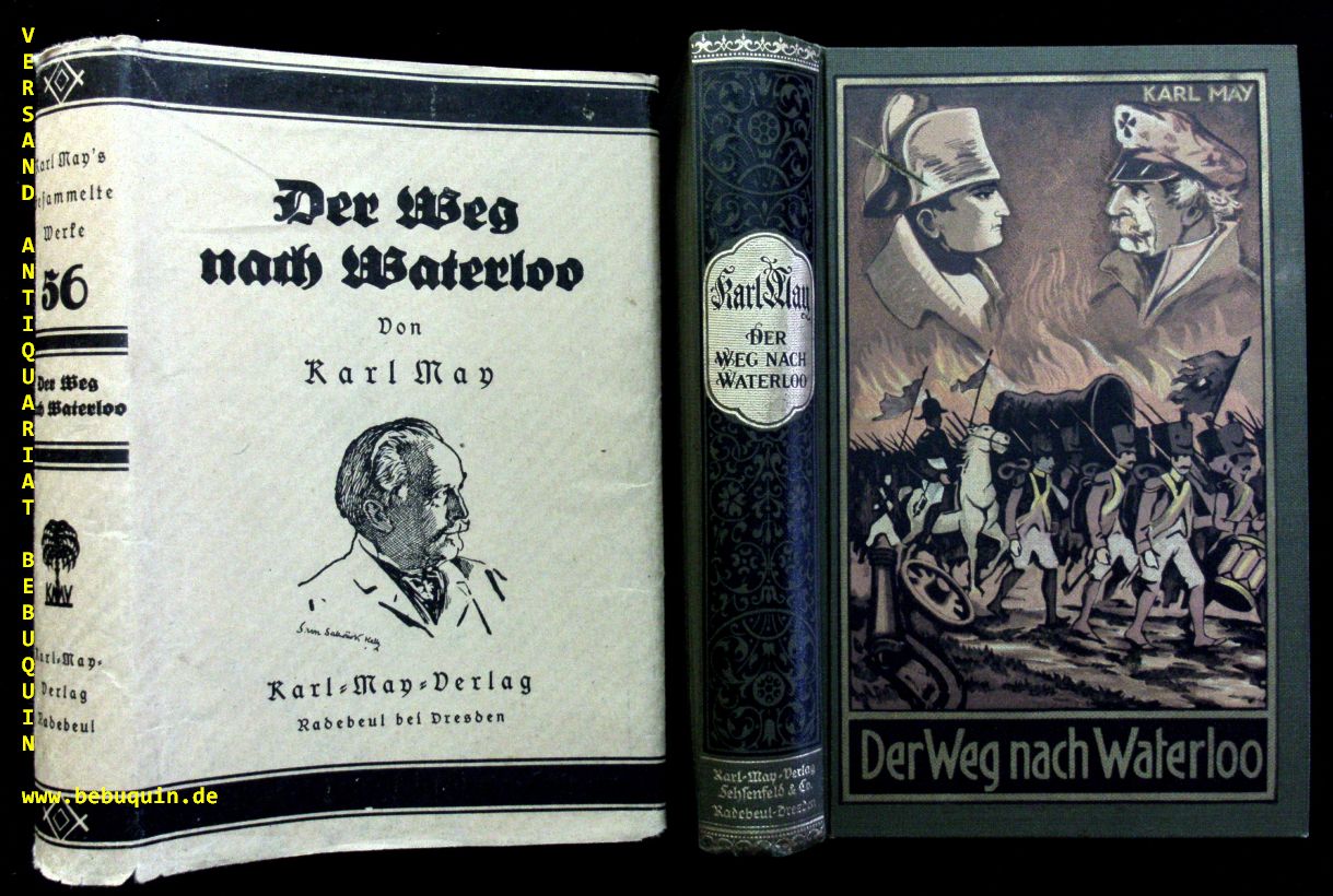 MAY, Karl: Der Weg nach Waterloo. Roman. Hrsg. von E.A. Schmid und Franz Kandolf. Radebeul (Karl May), (1930). 471 (1) S. farb. ill. OLn. mit OUmschl. (SU5). NaV, Ex libris verso Reihentitel, feines Ex. mit farbstarkem Einband, goldglänzendem Rücken und gutem Umschlag. = Gesammelte Werke, Bd. 56. EA. Hermesmeier / Schmatz GW 56.1.