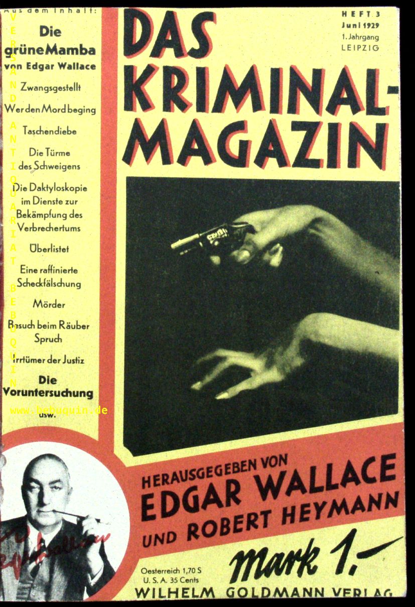 WALLACE, Edgar: (Hrsg.) Das Kriminal-Magazin. 1. Jahrgang. Heft 3, 18 und 20. 3 Hefte in 1 Bd. Leipzig (Goldmann), 1929. Gr. 8°. ca 300 S. mit zahlr. Abb. Hldr der Zeit mit eingebundenen farb. OKart-Einbänden. gutes Ex. in der Reihenfolge 3, 20, 18. recht seltenes Periodikum: „Spannungsgeladene Unterhaltungsliteratur, jenseits des klassischen, viktorianischen Locked-Room-Mistery im Stile eines Sherlock Holmes, wollte der Leipziger Verlag von Wilhelm Goldmann ab April 1929 auch an die Kioske bringen. Für seine illustrierte Monatsschrift »Das Kriminalmagazin« verwendete Goldmann nicht nur das bewährte rot-schwarze Design der seit 1927 gut eingeführten Wallace-Buchreihe, sondern auch deren typisches Logo mit dem Konterfei des Meisters im linken unteren Eck. Für eine Mark erwartete den Leser das magazinübliche Potpourri aus kurzen Beiträgen und Reportagen (natürlich zumeist aus dem Halbweltmilieu), Fotos und Illustrationen, dazu Rätsel und Lebenshilfe.