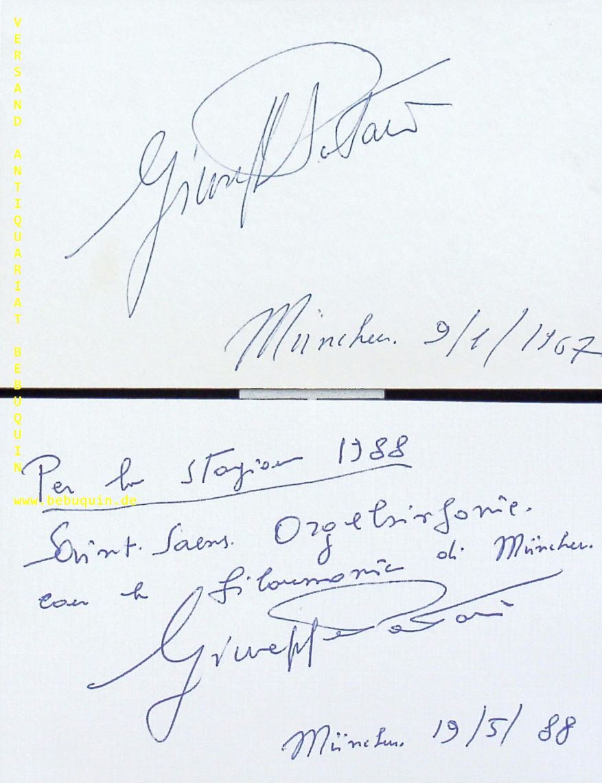 PATANE, Giuseppe (Dirigent): 2 eigenhändig signierte und datierte Autogrammkarten. München, 1967 – 1988. 8 x 12,5 cm. 2 Karteikarten. Giuseppe Patanè wurde in Neapel als Sohn des Dirigenten Franco Patanè (1908–1968) geboren und studierte in seiner Heimatstadt. Er debütierte dort 1951 am Teatro Mercadante. Von 1961 bis 1962 war er Chefdirigent an der Oper Linz, danach bis 1968 Dirigent an der Deutschen Oper Berlin. Weitere Stationen waren Debüts u. a. an der Mailänder Scala (1969), am Londoner Covent Garden (1973) und an der New Yorker Met (1978).Außerdem wirkte er noch als Musikdirektor der Arena di Verona (1983), als Ko-Chefdirigent beim American Symphony Orchestra (1982–1984) sowie als Chefdirigent am Nationaltheater Mannheim und am Münchner Rundfunkorchester (1988–1989). Patanè brach am 29. Mai 1989 plötzlich an einem Herzinfarkt während einer Aufführung von Gioacchino Rossinis Il barbiere di Siviglia an der Bayerischen Staatsoper in München zusammen. Er wurde ins Krankenhaus gebracht, wo er in den Morgenstunden des nächsten Tages starb. (Wikipedia)