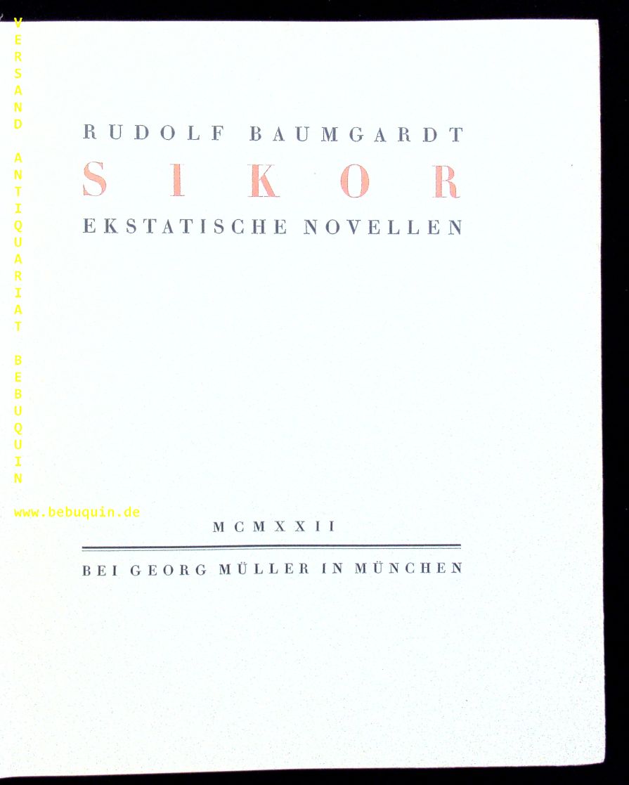 BAUMGARDT, Rudolf: Sikor. Ekstatische Novellen. München (Georg Müller), 1922. 4°. 209 (3) S. mit 7 Holzschnitten von Edmund Andernach. OHLn. mit marmorierten Deckeln. kaum fingerspurig, gutes Ex. Nr. 604 von 650 nummerierten Ex der frühen EA des Zoppoter Rechtsgelehrten, der sich besonders durch seine Biografien einen Namen machte.