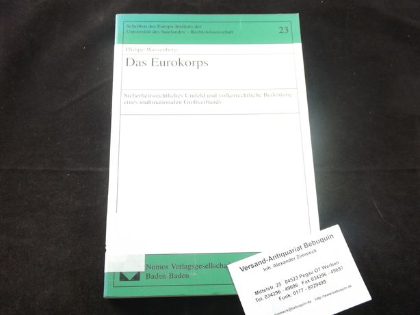 WASSENBERG, Philipp: Das Eurokorps. Sicherheitsrechtliches Umfeld und völkerrechtlikche Bedeutung eines multinationalen Großverbandes. Baden-Baden (Nomos), 1999. Gr. 8°. 242 (2) S OKart. Ordnungsgemäß aus Bundeswehrbeständen ausgesondertes Bibliotheksexemplar (Rückenschild, Stempel). = Schriften des Europa-Instituts 23. EA.