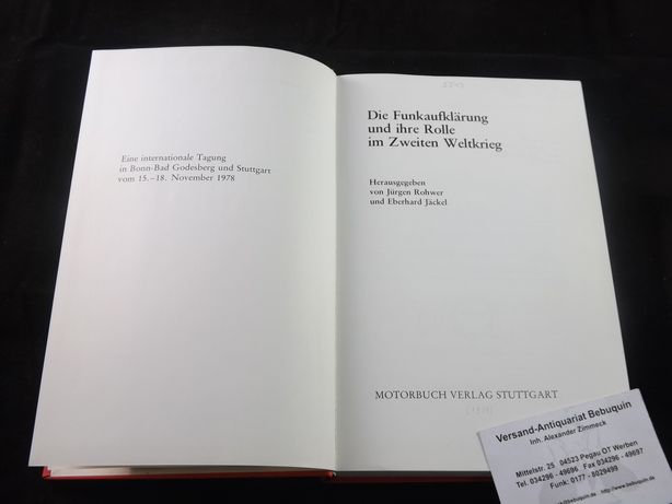 2. WELTKRIEG.– ROHWER, Jürgen + JÄCKEL, Eberhard: (Hrsg.) Die Funkaufklärung und ihre Rolle im Zweiten Weltkrieg. Stuttgart (Motorbuch), 1979. Gr. 8°. 406 (2) S. mit zahlr. Bildern. ill. OLn. Ordnungsgemäß aus Bundeswehrbeständen ausgesondertes Bibliotheksexemplar (Stempel, Rückenschild). seltene EA.