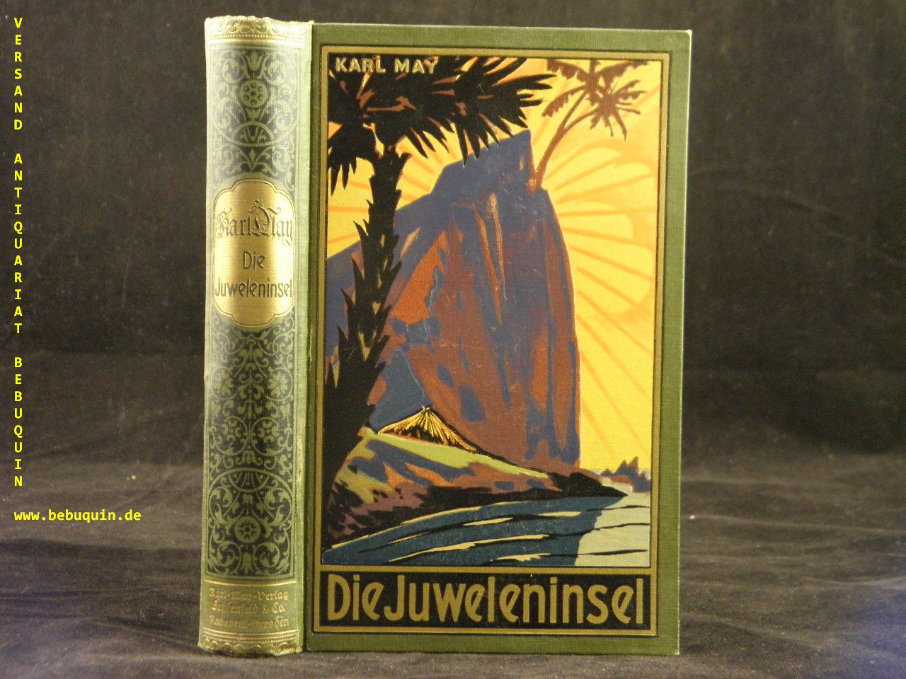 MAY, Karl: Die Juweleninsel. 1.– 20. Tsd. Radebeul (Karl May), 1926. 532 S. farb. ill. OLn. feines farbstarkes Ex. mit glänzendem Rückengold. = Gesammelte Werke, Bd. 46. EA. Hermesmeier /Schmatz GW 46.1. Inliegend der dazugehörende Flyer des Verlages: Zum Ausbau der Karl-May-Sammlung.