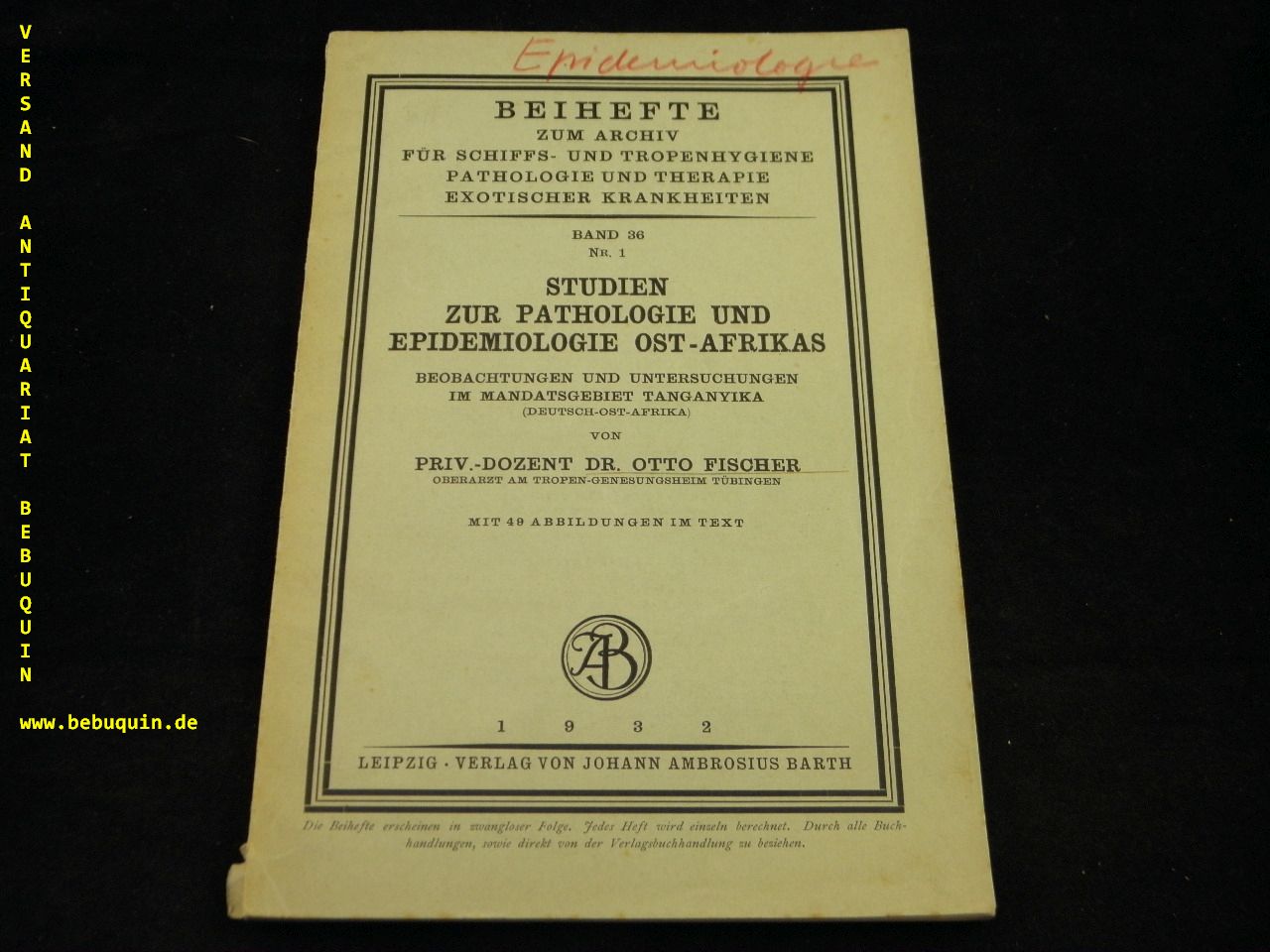 PARASITOLOGIE.– FISCHER, Otto: Studien zur Pathologie und Epidemiologie Ost-Afrikas. Beobachtungen und Untersuchungen im Mandatsgebiet Tanganyika. Leipzig (Barth), 1932. 104 S. mit 49 Textabb. OBr. NaU. = Beihefte zum Arcghiv für Schiffs- und Tropenhygiene, Bd. 36. EA.