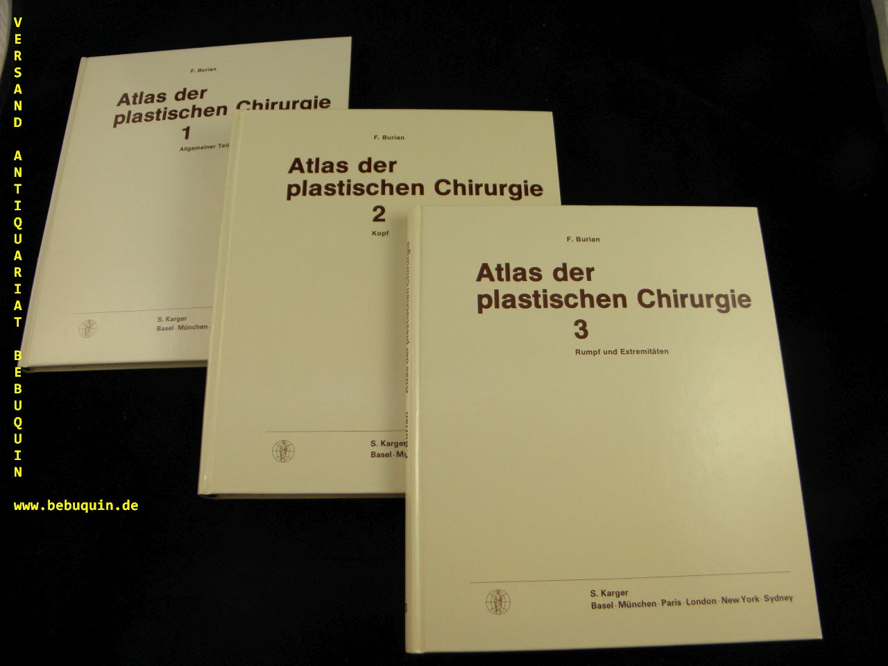 MEDIZIN.– BURIAN, F. Atlas der plastischen Chirurgie. D.v. H. Sostmann + A. Schertel. 3 Bände. Base (Karger), 1978. 4°. XV, 191, 495, 223 S. mit über 500 Abb. und zahlr. Tabellen. OPb in OSchuber. tadellos. dt. EA des gesuchten Standardwerkes.