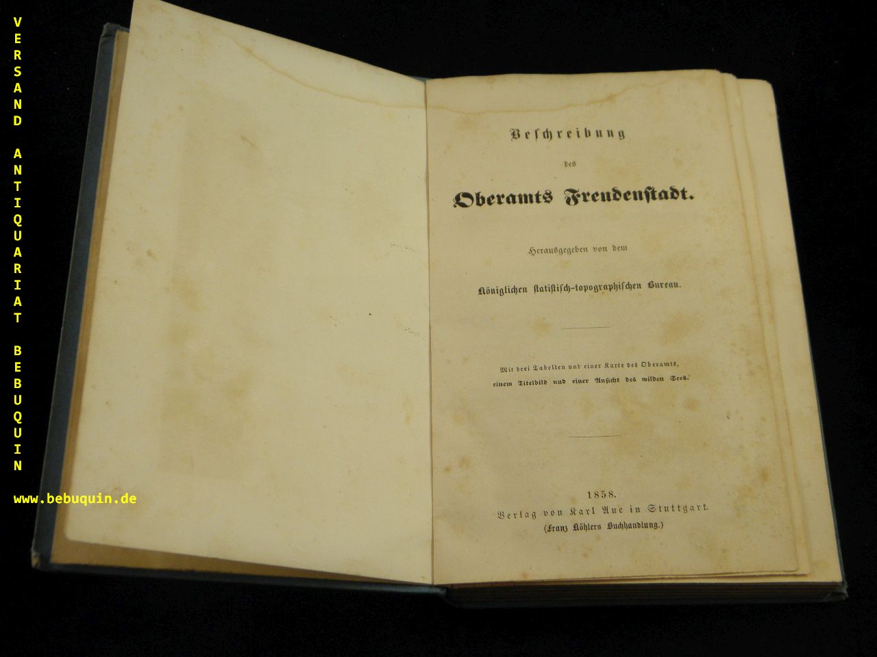 CRAILSHEIM.– BESCHREIBUNG DES OBERAMTS FREUDENSTADT.– Hrsg. vom Königlichen statistisch-topographischen Bureau. Stuttgart (Aue), 1858. 336 (von 342) S. mit 1 Titelstich, einer Ansicht des wilden Sees, 3 Tabellen und einer Faltkarte in Fotokopie. Pb der Zeit. anfangs leicht wasserrandig, es fehlen die Seiten 337 – 342. EA.