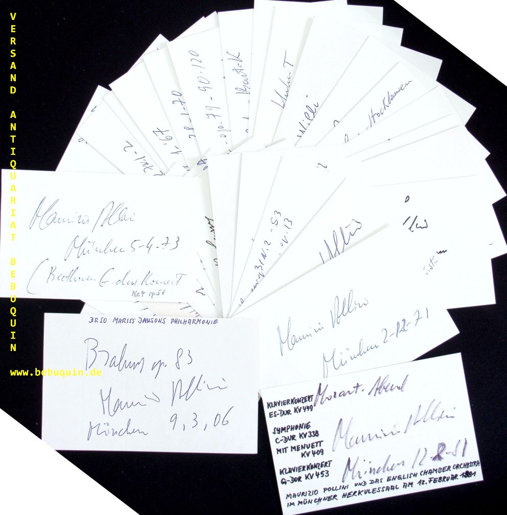 POLLINI, Maurizio (Pianist): 30 eigenhändig signierte und datierte Autogrammkarten mit einigen eigenhändigen Programmbeschreibungen und Grüßen „Für Willi″. München (Herkulessaal), 1970 – 2007. 8 x 12,5 cm. 30 Karteikarten. vereinzelt rostspurig. Maurizio Pollini (* 5. Januar 1942 in Mailand) ist ein italienischer Pianist und Dirigent. (Wikipedia)