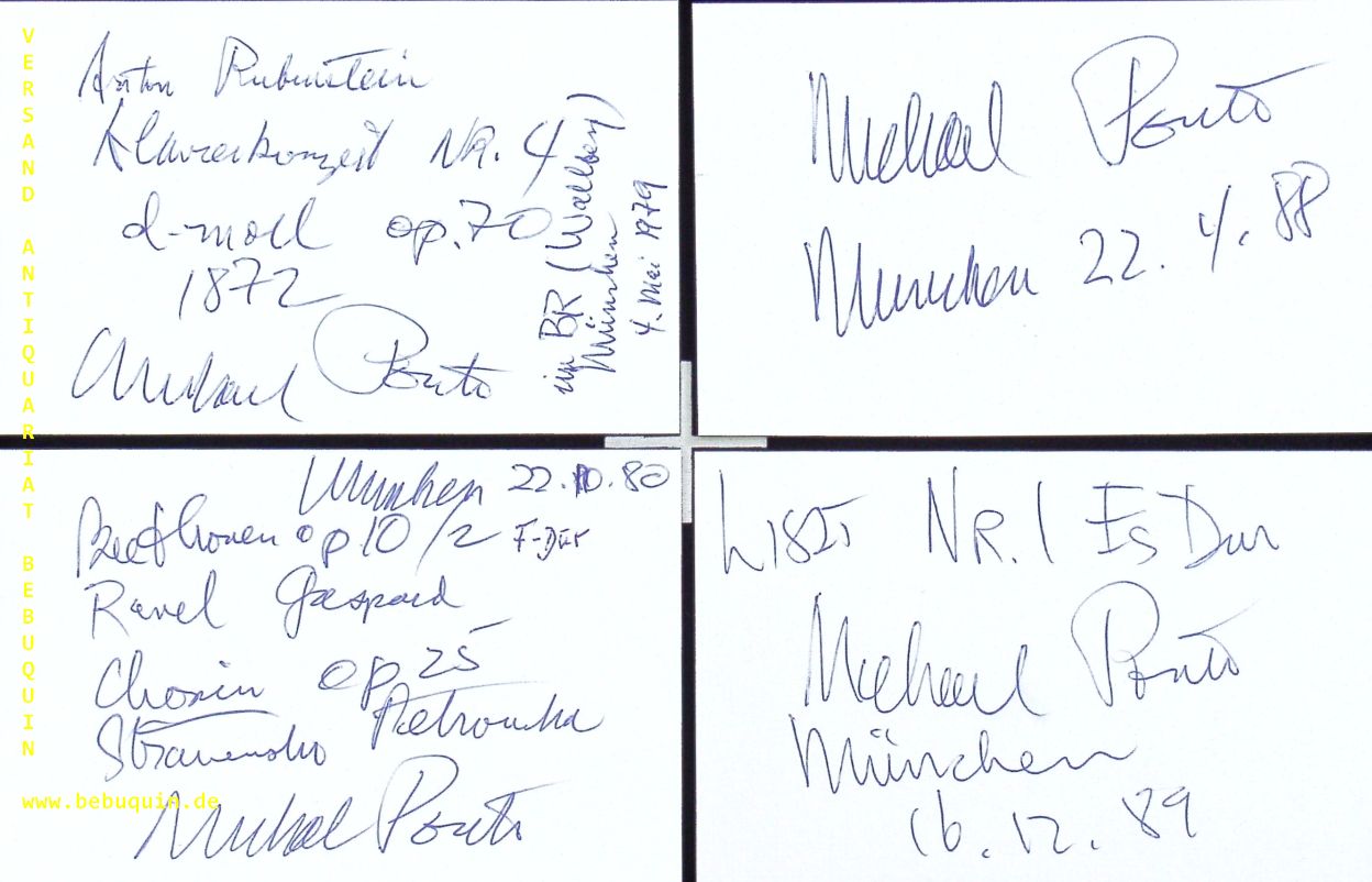 PONTI, Michael (Pianist): 6 eigenhändig signierte und datierte Autogrammkarten. München (Philharmonie), 1977 – 1989. 8 x 12,5 cm. 6 Karteikarten. Michael Ponti (* 29. Oktober 1937 in Freiburg im Breisgau) ist ein US-amerikanischer Pianist, der in Deutschland geboren und teilweise ausgebildet wurde. (Wikipedia)