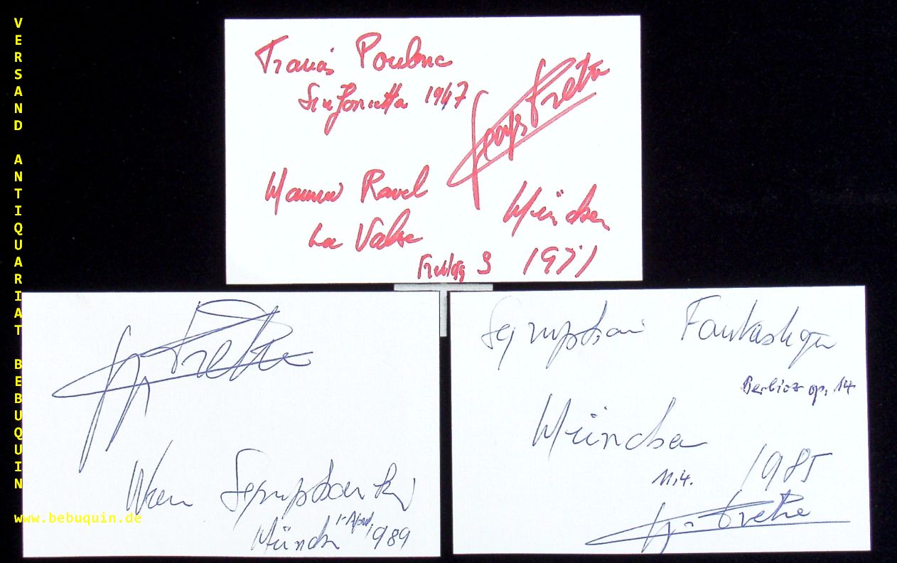 PRETRE, Georges (Dirigent): 3 eigenhändig signierte und datierte Autogrammkarten. München (Philharmonie), 1971 – 1989. 8 x 12,5 cm. 3 Karteikarten. ekndrucksvoll signierte Stücke. Georges Prêtre (* 14. August 1924 in Waziers bei Douai, Frankreich; † 4. Januar 2017 in Navès, Département Tarn, Frankreich) war ein französischer Dirigent. Er war Generalmusikdirektor der Pariser Oper und seit 1956 in der Opéra-Comique in Paris. 1966 dirigierte er die letzte Aufführung in der alten New Yorker Metropolitan Opera und wenig später ebenso die Eröffnung des Neubaus. Von 1986 bis 1991 war er „Erster Gastdirigent“ der Wiener Symphoniker. Er leitete regelmäßig die großen Orchester Europas und Amerikas, darunter die Berliner Philharmoniker (Waldbühnen-Konzert 1992) und die Wiener Philharmoniker. Prêtre galt als Spezialist der Musik seiner Heimat, insbesondere setzte er sich für die Werke von Francis Poulenc ein. 1959 dirigierte er die Uraufführung von dessen Monooper La voix humaine. Maria Callas schätzte ihn besonders, Herbert von Karajan förderte ihn. In jungen Jahren trat er auch unter dem Pseudonym Georges Dhérain auf. 2008 dirigierte er – mit 83 Jahren bis dahin der älteste Dirigent – das Neujahrskonzert der Wiener Philharmoniker; 2010 dirigierte er es zum zweiten Mal. 2005 und 2009 leitete er das Neujahrskonzert von Venedig am Teatro La Fenice. Zuletzt stand er im Oktober 2016 im Wiener Musikverein am Pult der Wiener Symphoniker. (Wikipedia)