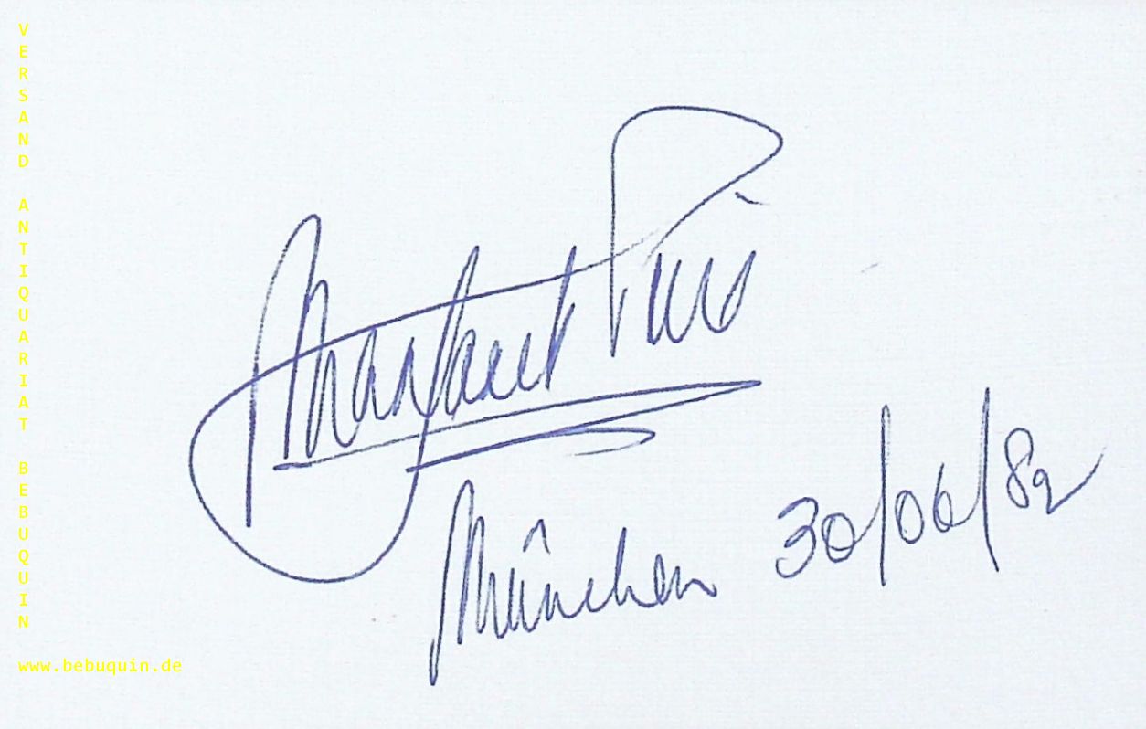 PRICE, Margaret (Sopran): eigenhändig signierte und datierte Autogrammkarte. München, 30.6.1982. 8 x 12,5 cm. Karteikarte. Dame Margaret Berenice Price (* 13. April 1941 in Blackwood, Monmouthshire, Wales; † 28. Januar 2011 nahe Cardigan) war eine walisische Opernsängerin (Sopran). (Wikipedia)
