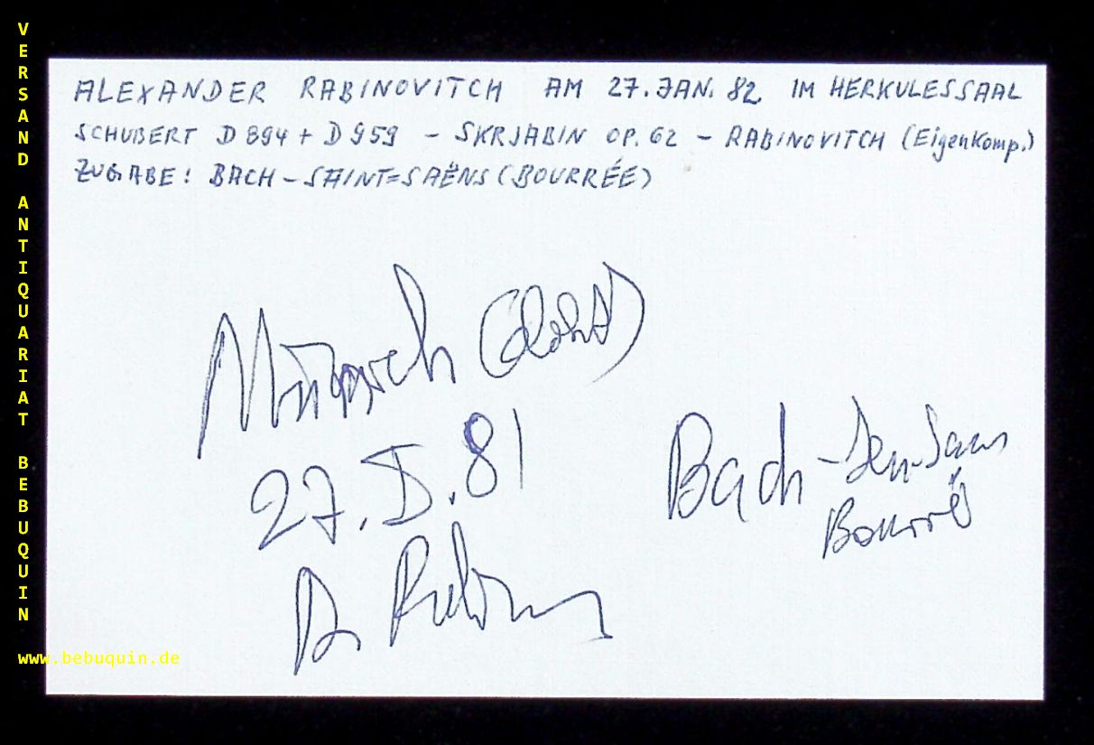 RABINOWITCH, Alexander (Pianist): eigenhändig signierte und datierte Autogrammkarte. München (Herkulessaal), 27.1.1982. 15 x 21 cm. Karteikarte. Alexandre Rabinovitch-Barakovsky (born 30 March 1945) is a Russian-born composer, conductor and classical pianist who lives in Switzerland. He is one of the first composers of minimalism (from 1969); „La Belle Musique N.3“ (1977) is the first work for orchestra in the minimalist field. He emigrated to Paris from Moscow in 1974, and now lives in Switzerland. He has collaborated with numerous musical artists, notably with the pianist Martha Argerich, with whom he has recorded works by Rachmaninoff and Brahms. (Wikipedia)